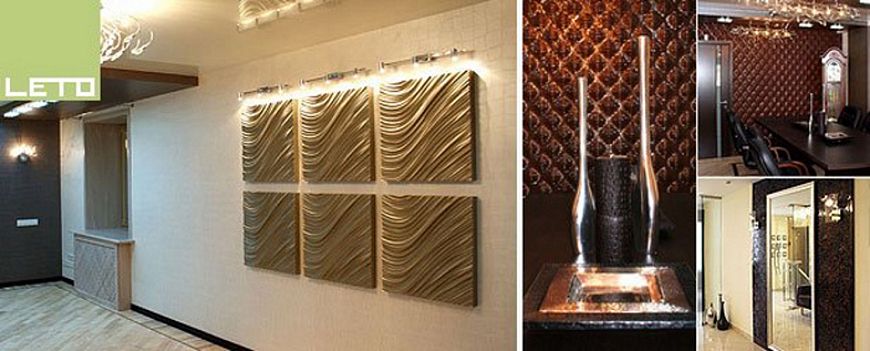 Офис генерального директора, зона для совещаний и приемная компании оформлены при помощи рельефных 3D панелей LETO, которые прекрасно вписались к крокодиловой коллекции обоев и к мебели со вставками из крокодиловой кожи. В кабинете генерального директора центральное место на стене занимает композиция из шести панелей TEMPESTA 0009 , подсвеченная сверху для придания текучести рельефу подобно горячему металлу. В зоне для совещаний всю стену украшает отделка декоративными панелями COLLINA 0011 с великолепным рельефом и покрытием глянцевой эмалью цвета «коньяк». При включении люстр с кристаллами Swarovski панели переливаются, подобно сами инкрустированы ими. Панели прекрасно сочетаются с наборным паркетом и врезкой из индонезийского венге в виде логотипа компании.