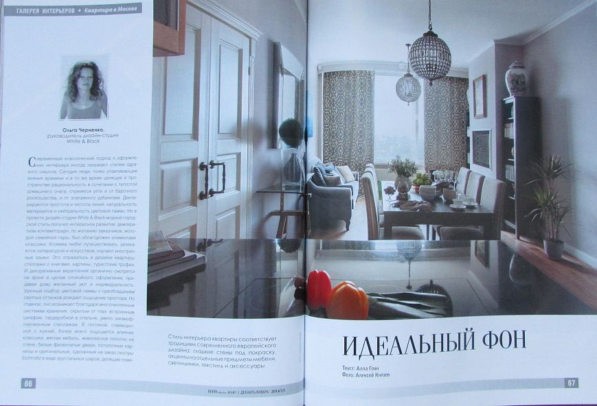 Наш проект "Идеальный фон" опубликован в журнале ELITE Interior №12/107 декабрь/январь 2014/2015. Дизайн квартиры для семьи из 2-х человек был разработан в современном стиле с использованием неоклассических элементов.