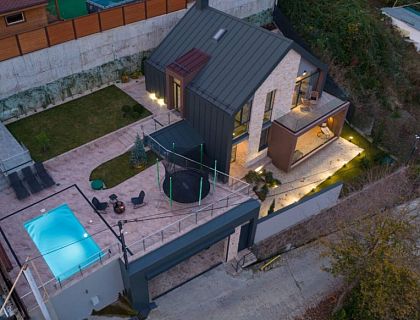 В качестве исходных данных у нас был продолговатый участок неправильной формы в живописном месте. Участок расположился в уже сложившейся застройке. Мы гармонично вписали архитектуру в имеющиеся габариты участка таким образом, чтобы все жилые помещения располагались на благоприятную южную и юго-восточную сторону. Две детские комнаты; Мастер-спальня с большой консолью, которая формирует зону беседки.