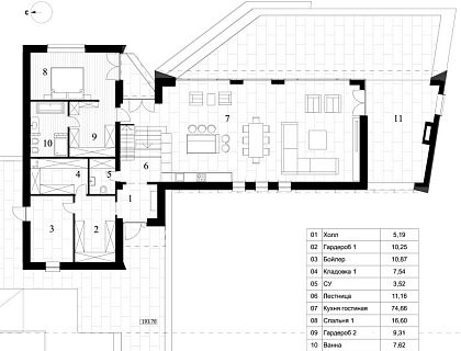 Мы охарактеризовали стиль этого интерьера как современный с элементами этники. Этнические элементы воплощены в цветовой гамме — преобладают землистые тона, зеленые и коричневые оттенки. Форма полок в гостиной напоминает письмена африканских племен. Журнальный столик из дерева и узорчатый ковер развивают этнический мотив. Мы приняли решение сделать акцент на цветах и фактурах и при этом не выходить за рамки лаконичных решений. Проект выполнен совместно с дизайнером Алексеем Булыгиным.