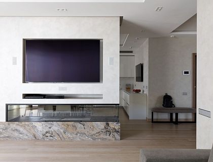 Подвесная итальянская кухня Bizotto Infinity с мягкой подсветкой и параллельной планировкой. Фасады в перламутровом сверхглянце наполняют пространство светом и изяществом. Столешница из кварцевого агломерата, техника Gaggenau и аксессуары Blanco создают гармонию красоты и функциональности.
