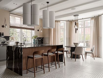 Дом в английском стиле от бюро SABLINA A&D, общая площадь- 750 кв.м.   Главная идея - объединение активного образа жизни заказчиков с загородным умиротворением классического дома. Выдержан в общей концепции коттеджного поселка и дополнен современными деталями: крытая въездная зона в гараж с классическим фронтоном над ней, большая терраса со стеклянной перголой за домом с выходом из кухни. Украшение дома- классические элементы английской архитектуры: круглое окно мансардного этажа и эркер.