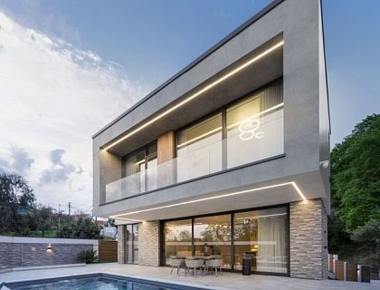 Villa Neoshale — проект ArchiNova Studio в Мацесте, где классический стиль шале получил современное прочтение. Мы совместили его с минимализмом, подчеркнули пластику панорамными витражами и создали лаконичный образ, органично вписанный в горный ландшафт. Фасады выполнены в комбинации белой камешковой штукатурки и натурального камня, что придало архитектуре элегантность и выразительность.