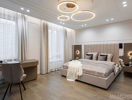 Проект разработан в стилистике современной скандинавской эстетики, где акцент делается на просторные, наполненные светом пространства, натуральные текстуры и качество материалов. Чистые белые поверхности стен и потолков служат нейтральным фоном, уравновешенным акцентными покрытиями с выраженной текстурой дерева. Гармоничное взаимодействие естественного и сценарного искусственного освещения. Свет подчеркивает фактуру отделочных материалов, создавая теплую атмосферу и ощущение единения с природой.