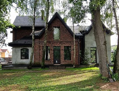 Двухэтажный кирпичный дом в классическом стиле с отделкой из облицовочного кирпича. Расположен на большом участке в Куровском Московской области.