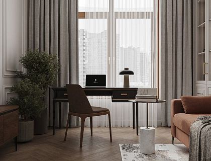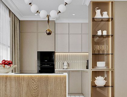 Дизайн светлой квартиры в зеленых тонах. Длинная угловая кухня. Уникальный стиль проекта и планировка: длинная Г-образная кухня, раковина в комнате, классическая спальня с зеркалом и детской комнатой. Парящая подсветка, зеркала и сочетание нескольких оттенков зеленого в необычном дизайне квартиры в ЖК  Галактика ПРО. Разработка и реализация проекта — Katushhha Studio.