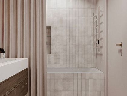 Дизайн квартиры в стиле современной классики на 60 м² объединяет уют и функциональность. Бежевые оттенки визуально расширяют пространство, создавая гармоничную атмосферу. Ассиметричная планировка включает светлую кухню-гостиную с удобной зоной отдыха и обеденным столом. В спальне — элегантность с цветочными обоями и функциональной мебелью. Ванная оборудована душевой и скрытой прачечной, что обеспечивает комфорт и порядок.