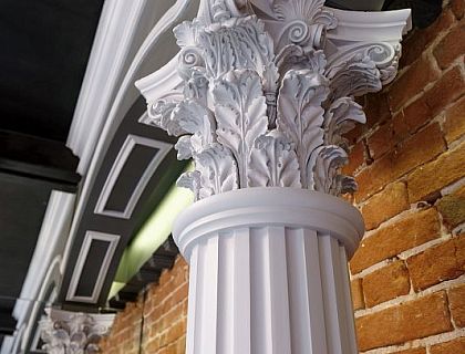 Естественная красота не многословна. Натуральные местные материалы, окружающая природа Воронежского края, все это создало гармонию и выразительность проекту. На холмистом ландшафте, выделяется своей торжественностью и величием, коттедж из бревен, украшенный чёрными коваными перилами с завитками.