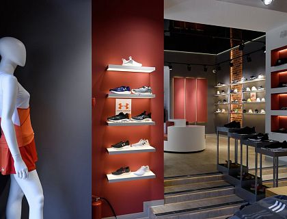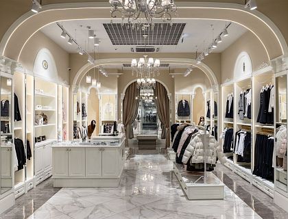 Бутик детской одежды находится в ТЦ Лето, в СПБ. Вся мебель и оборудование для бутика выполнена на заказ по индивидуальным эскизам. Кассовая зона в центре зала и выполнена трехсторонней, в  виде овала со стеклянными дверьми. В зале есть камин и зона ожидания.
