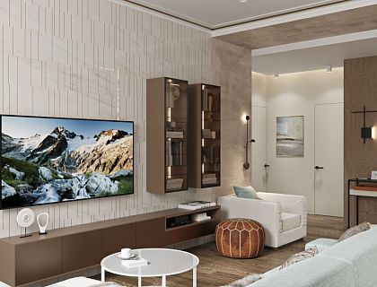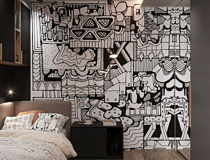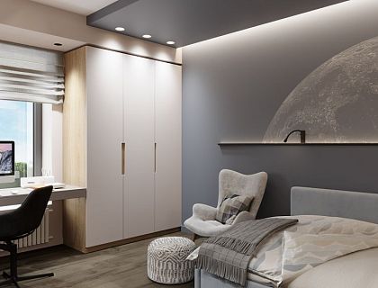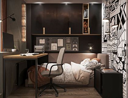 С трудом можно сказать, что этот проект только одной жилой комнаты, так как в этом пространстве организованы три основные зоны: рабочая, спальная и зона отдыха (гостиная). Проект был выполнен для молодого человека, который только в самом начале своего жизненного пути. Сложный интерьер - отражение его разносторонней личности.