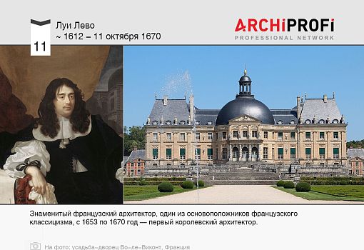 Луи Лево - французский архитектор, один из основоположников французского классицизма, с 1653 по 1670 год - первый королевский архитектор.