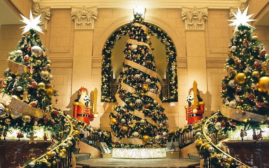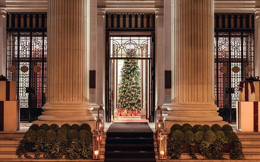 Архитектурные элементы фасада отеля Four Seasons Ten Trinity Square – великолепное окружение величественного рождественского дерева, стоящего в холле гостиницы.