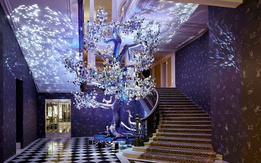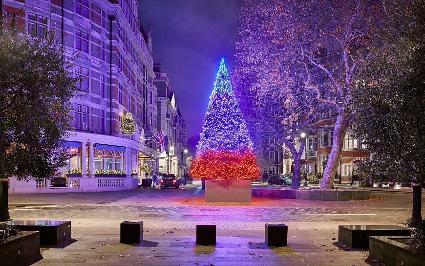 Елку возле лондонского отеля The Connaught каждый год проектируют разные дизайнеры и архитекторы. В этом году такая честь выпала сэру Майклу Крейгу-Мартину. Гирлянды лесной красавицы состоят из 12 000 лампочек.