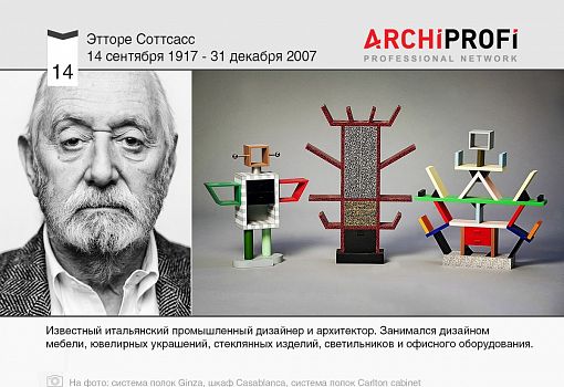 Этторе Соттсасс - известный итальянский промышленный дизайнер и архитектор. Занимался дизайном мебели, ювелирных украшений, стеклянных изделий, светильников и офисного оборудования.