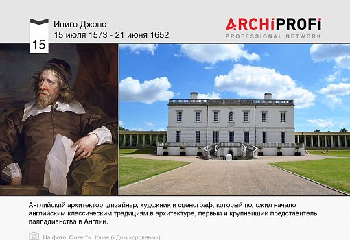 Иниго Джонс - английский архитектор, дизайнер, художник и сценограф, который положил начало английским классическим традициям в архитектуре, первый и крупнейший представитель палладианства в Англии.