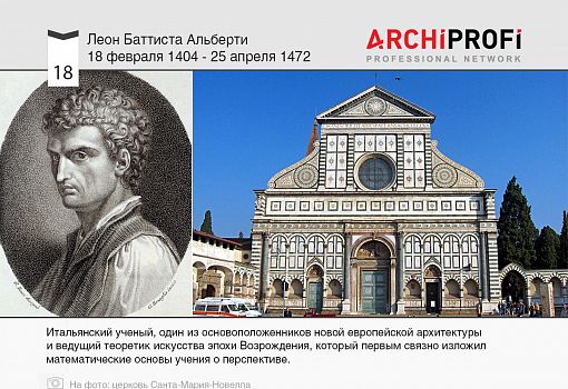 Леон Баттиста Альберти - итальянский ученый, один из основоположников новой европейской архитектуры и ведущий теоретик искусства эпохи Возрождения, который первым связно изложил математические основы учения о перспективе.