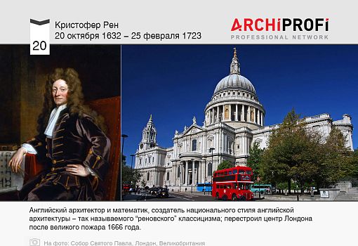 Кристофер Рен - английский архитектор и математик, создатель национального стиля английской архитектуры - так называемого “реновского” классицизма; перестроил центр Лондона после великого пожара 1666 года.
