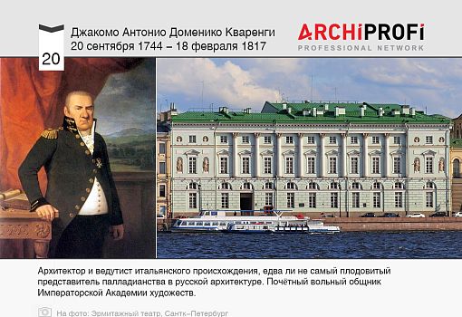 Джакомо Кваренги - известный архитектор и ведутист итальянского происхождения, едва ли не самый плодовитый представитель палладианства в русской архитектуре. Почётный вольный общник Императорской Академии художеств.