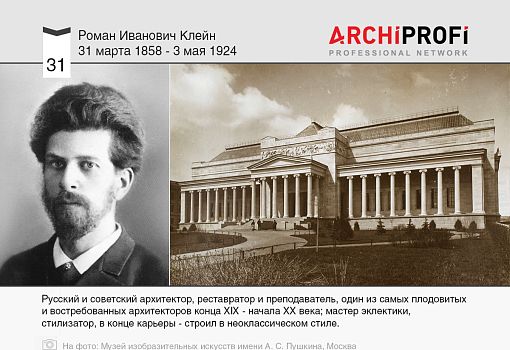 Роман Иванович Клейн - русский и советский архитектор, реставратор и преподаватель, один из самых плодовитых и востребованных архитекторов конца XIX - начала XX века; мастер эклектики, стилизатор, в конце карьеры строил в неоклассическом стиле.