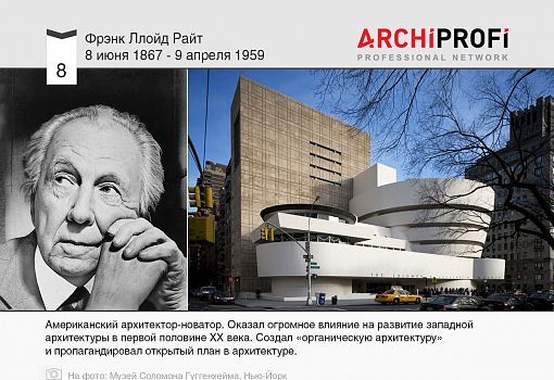 Фрэнк Ллойд Райт — американский архитектор-новатор. Оказал огромное влияние на развитие западной архитектуры в первой половине XX века. Создал «органическую архитектуру» и пропагандировал открытый план в архитектуре.