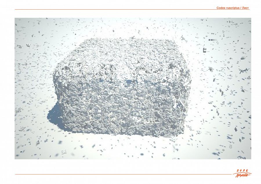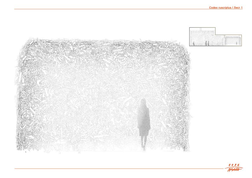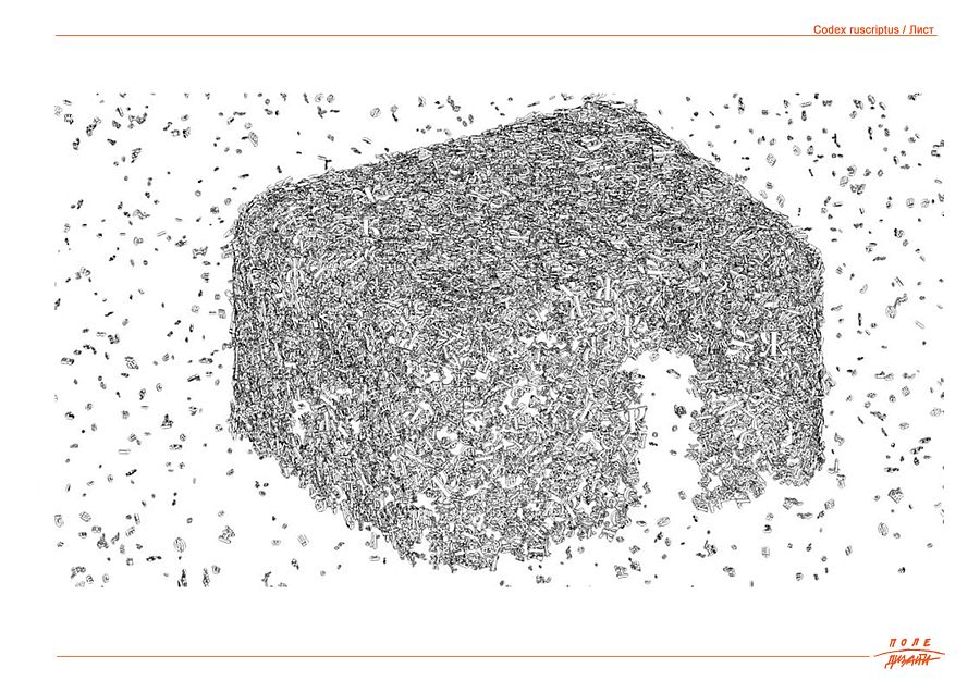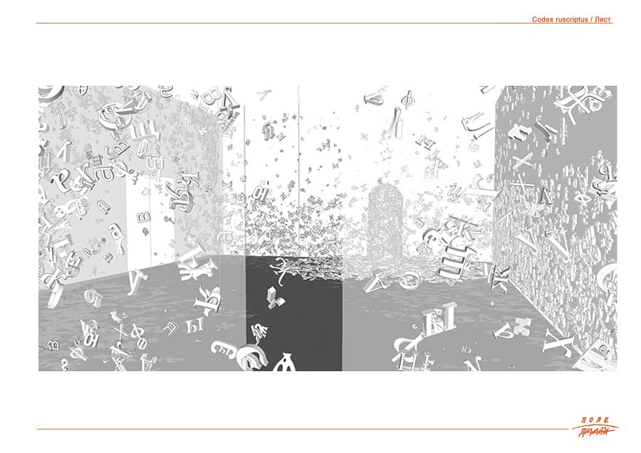Безусловно идентичное, абсолютно формальное, отличное от привычной взгляду зрителя латиницы, лишенное «смысла» и содержания текста – оставленное в перцептуальной связи «свободной» композиции – сочетание букв из разных эпох, шрифтов, текстов. Композиция из разномасштабных букв, собранная в пространственную инсталляцию, создающую эффект «погружения» в бесконечность начертания знаков – в силуэты, в сочетания, в слои – в средовой «палимпсест».