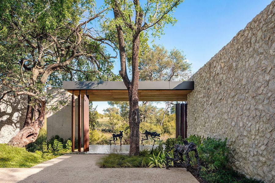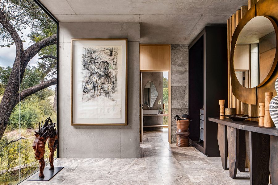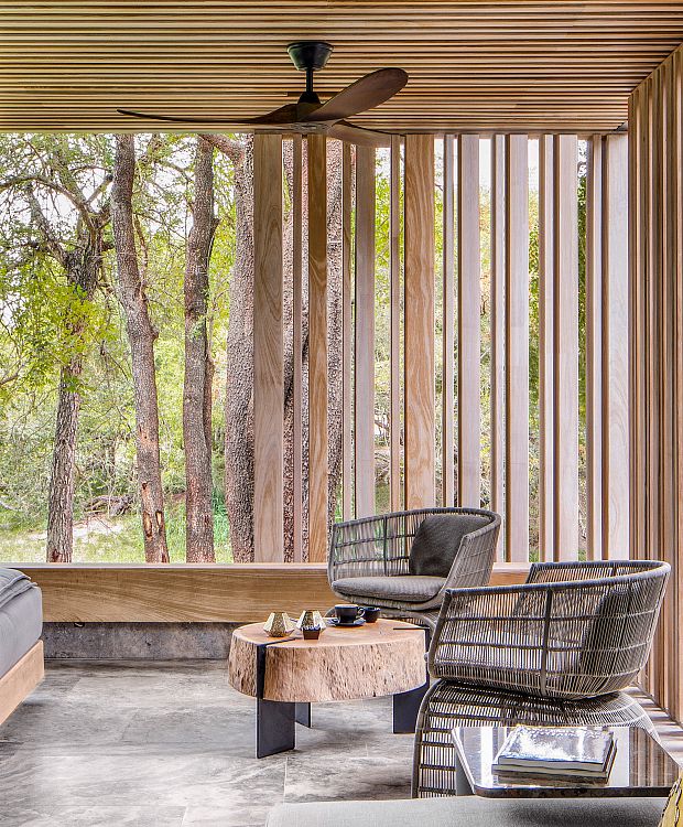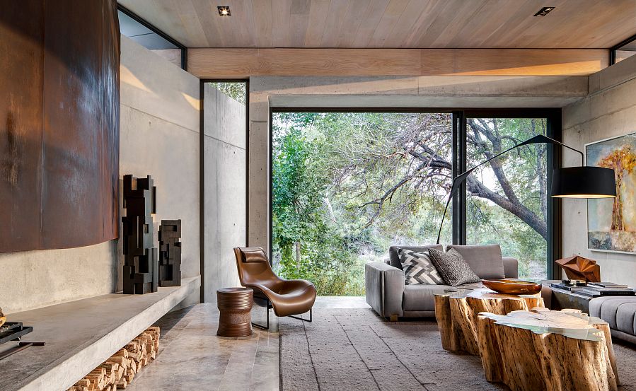 В качестве основных материалов архитекторы выбрали гладкий бетон, стекло, местный камень мика, кортеновскую сталь. Вся мебель выполнена из дерева местными мастерами.
