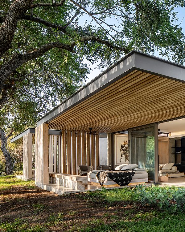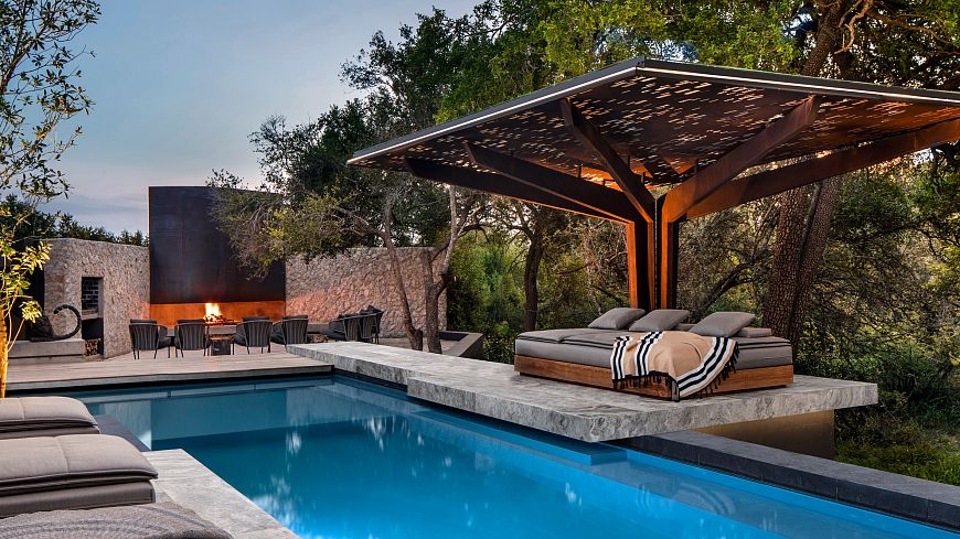 Гостевой дом представляет собой жилой кластер, состоящий из нескольких построек. Каждая из них включает основной объем со спальнями, а также череду открытых и закрытых пространств разного назначения. Все здания отличает одна планировочная особенность — гостиные и столовые с открытым планом, без межкомнатных перегородок. В каждом домике предусмотрен кинозал, дегустационный винный зал с кондиционированием, подогреваемый бассейн, а также традиционная зона бома, где происходят посиделки и застолья в ночное время. Часто для зонирования используются деревянные экраны.