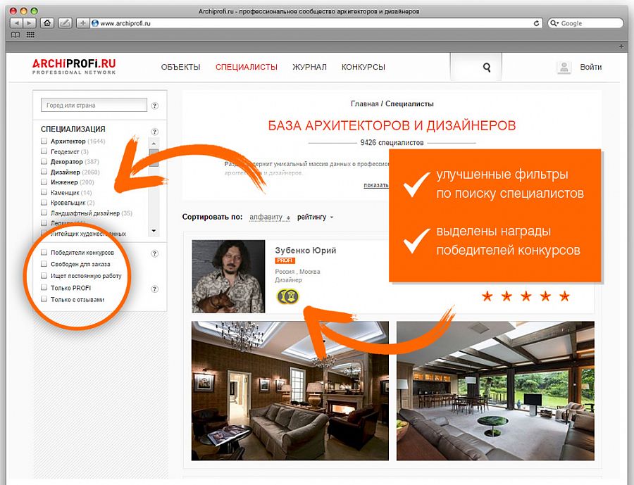 - Мы улучшили фильтры по поиску специалистов. Теперь можно найти того, кто обладает статусом Profi, разыскать отзывы на работы, обнаружить имена победителей того или иного конкурса.