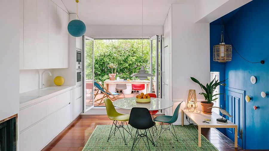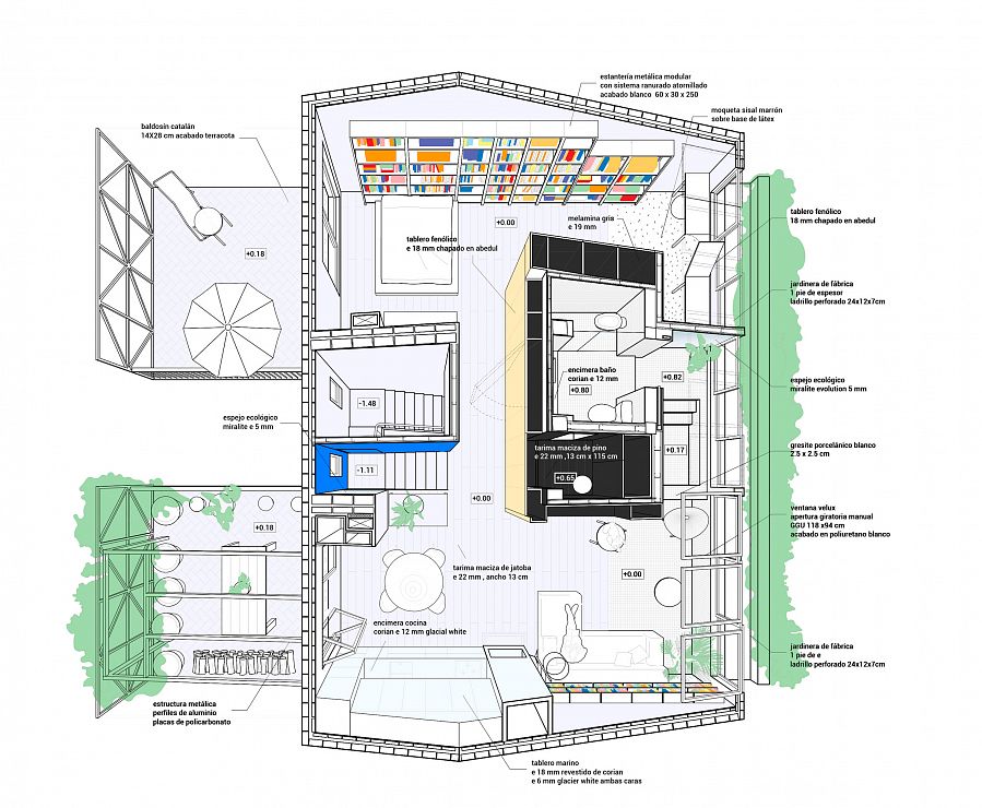Вообще, нужно сказать, что ванная комната – одно из самых привлекательных помещений мансарды. Сквозь распахнутые окна и люк, прорезанный в крыше, внутрь попадает солнечный свет. Зеленые насаждения, которые растут по всей длине балкона, затеняют и закрывают от любопытных глаз все, что происходит не только в ванной комнате, но и в кабинете, и в лаунже с диванной группой. Так острый и любопытный планировочный ход стал «фишкой» всей интерьерной концепции.