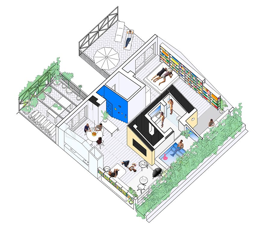 Своеобразие зонирования интерьера в том, что санузел, душевая и гардеробная заключены внутрь обшитого деревом встроенного объема. С одной его стороны имеется замаскированный вход, который никогда не будет обнаружен человеком, не знакомым с этим секретом. С другой стороны оборудован спуск в огромную, отделанную мелкой плиткой ванну, больше напоминающую мини-бассейн. Таким образом, несмотря на отсутствие межкомнатных перегородок авторам проекта удалось обособить личную территорию хозяина и обеспечить ее приватность.