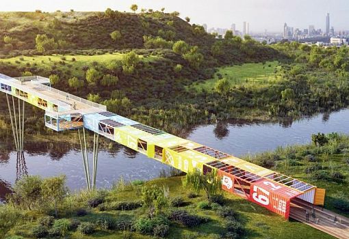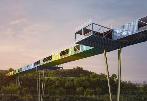 Архитекторы из Тель-Авива Yoav Messer Architects предложили амбициозный проект входной зоны Национального парка Ариэля Шарона. Для организации доступа к смотровым площадкам архитекторы предложили построить мост длиной 160 метров из морских контейнеров. Выбор материала не случаен, ведь ежегодно в мире на свалку попадает более 800 000 морских контейнеров.