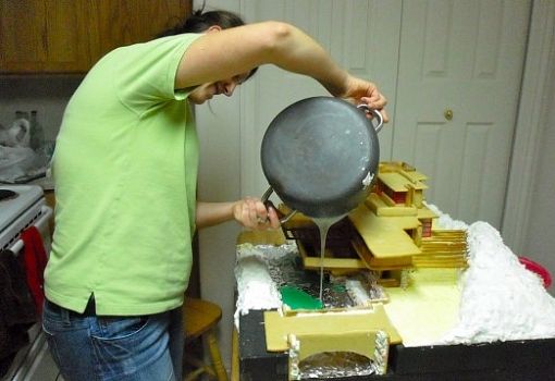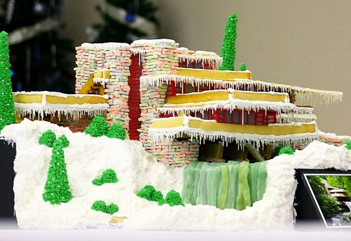 Новый взгляд на шедевр Фрэнка Ллойда Райта, знаменитый «Дом над водопадом» (1930-е, Западная Пенсильвания) продемонстрировали… кондитеры! Студия Garden Melodies создала копию сооружения из карамели, 164 маленьких имбирных пряников и сахара в качестве «цемента». Воссозданный зимний пейзаж подчеркивает не только архитектурную составляющую, но и праздничный дух проекта.