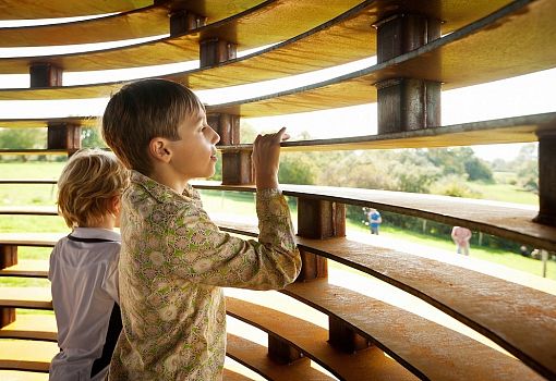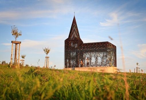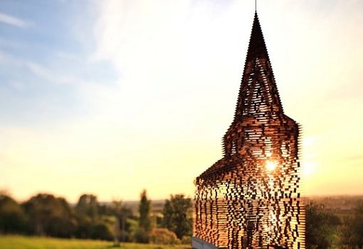 Сложно представить более причудливое сооружение, чем объект Reading Between the Lines («Читая между строк») от архитекторов студии Gijs Van Vaerenbergh в Лимбурге (Бельгия). Здание было построено для участия в фестивале Art Museum Z33. На возведение конструкции высотой в 10 метров ушло 30 тонн стали: 100 слоев и 2000 небольших колонок, расположенных в шахматном порядке. Церковь (а это церковь!) фактически представляет собой динамично меняющуюся в зависимости от угла зрения оптическую иллюзию, но особенно эффектно она смотрится «на просвет» в лучах заходящего солнца.