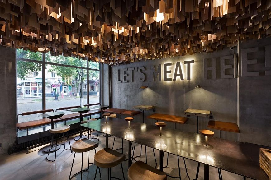 Аскетичный интерьер создали дизайнеры студии YOD в Полтаве (Украина) для одного кафе. Основная особенность пространства – это частокол фанерных плиток, которые свисают с потолка и контрастируют с бетонными стенами.