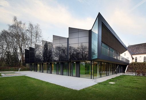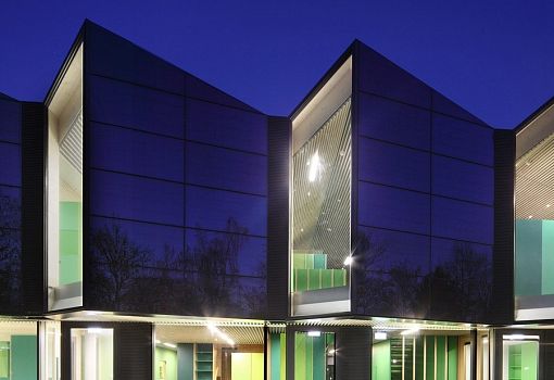 Архитектурное произведение в авангардном стиле выполняет функции детского сада в Марбурге (Германия). Компактное двухэтажное здание Nursery +E от архитекторов Opus Architekten располагает 335 кв.м. полезных площадей. Сооружение будто собрано из отдельных элементов угловатой формы, при этом благодаря нетривиальному исполнению кровли удалось увеличить площадь солнечных батарей. Здание в зеленых тонах со стеклянным фасадом органично интегрировано в окружающее пространство.