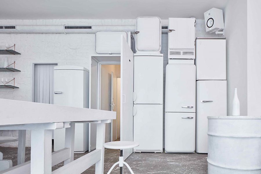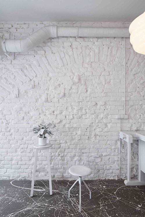 Вместо столов архитекторы использовали старые деревянные верстаки. Кроме этих «заслуженных» предметов в баре присутствуют холодильники разного размера, которые используются по назначению — для охлаждения вина. Круглые винтовые табуреты заменяют привычные барные стулья. Интерьер целиком выдержан в белом цвете. Даже рельефные кирпичные стены, полы, оставленные на виду трубы и колонки акустической стереосистемы окрашены белым. На этом «стерильном» фоне ярким пятном выделяется неоновый логотип винного бара. В качестве приставного столика, декорированного винными бутылками, авторы выбрали железную бочку. Еще одна примечательная деталь — круглое зеркало, закрепленное на потолке прямо над столами-верстаками.