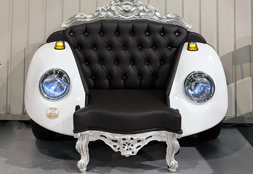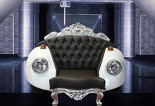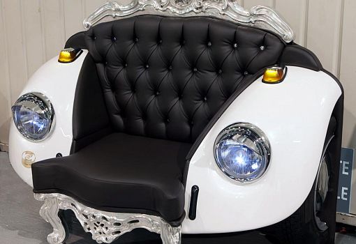 На Миланской неделе дизайна студия представила кресло Glamour Beetle – яркий манифест своего творческого кредо. Типично барочные спинка и передние ножки модели вырезана из массива дерева и вручную отделаны листовым золотом или серебром. В кресле использованы детали реального «Фольксвагена Жука» образца 1968 года: колеса, фары, части кузова. Мягкая спинка обита кожей (в качестве вариантов – искусственная кожа или ткань) и декорирована классической простежкой капитоне, вот только вместо ожидаемых характерных утопленных пуговиц – крупные кристаллы Swarovski.