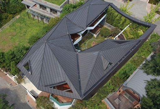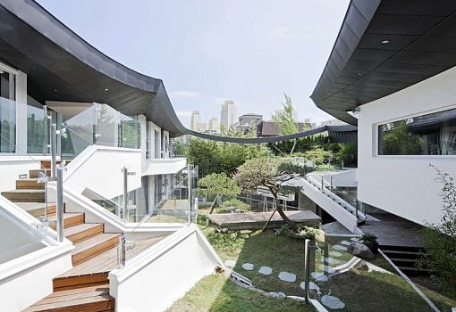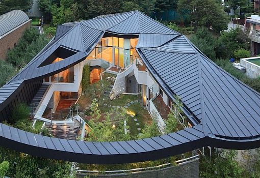 Одним из требований к дому Ga On Jai (Кван Мю Онг, Корея), спроектированного бюро IROJE KHM Architects, стала закрытость пространства. Таким образом, у авторов получилось отгородить обитателей дома от окружающего ландшафта; при этом они органично интегрировали эту структуру в городскую среду. Форма кровли «копирует» горный пейзаж, а внутри созданы уютные пространства с использованием дерева и бетона в сочетании с зеленой растительностью. Несмотря на некоторую обособленность, вилла имеет множество открытых террас и балконов, которые позволяют сооружению «не замыкаться».