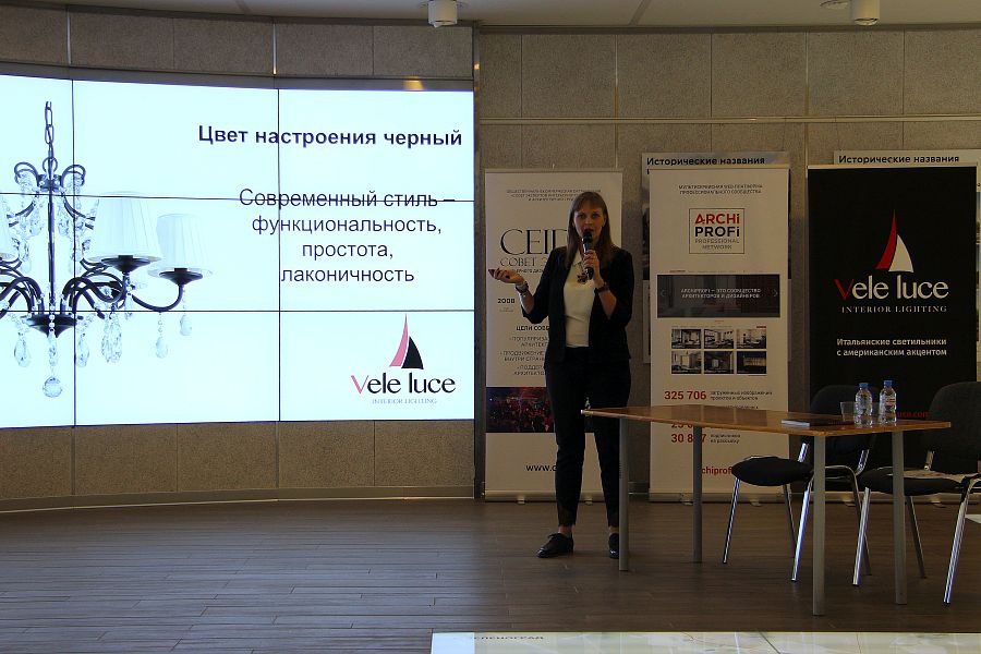 В финале вечера перед собравшимися выступила бренд-директор компании Vele Luce Вероника Ромашова, которая рассказала о трендах в дизайне современных светильников на примере продукции,выпускаемой под брендом Vele Luce.