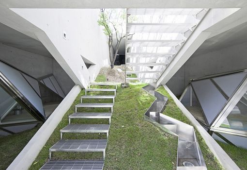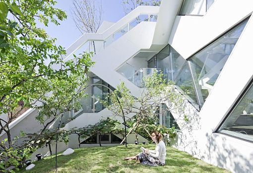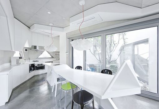 «Цветущий дом» в Сеуле был разработан архитектурным бюро IROJE KHM специально для клиента, который пожелал жить максимально близко к природе. Внешне этот особняк напоминает цветок лотоса, а расположен он неподалеку от национального парка. Снаружи дом покрыт ковром газона и пышной зеленой растительностью. В центре композиции дизайнеры создали несколько открытых двориков с зелеными насаждениями. Даже лестничные пролеты выполнены в виде лужаек. Внутреннее устройство дома соответствует его наружной геометрии. Угловатую форму имеют не только интерьеры, но даже мебель и предметы декора. Внутренние помещения буквально залиты естественным светом благодаря огромным панорамным окнам, расположение которых было тщательно продумано архитекторами. Парковка для четырех автомобилей находится на самом нижнем уровне, а гостиная на первом этаже. Дополнительный зал расположен на верхнем этаже, рядом с основной спальней и столовой. Необычный дизайн постройки отчасти продиктован рельефом местности. Угловатые фасады проектировались не только из эстетических, но и из практических соображений: сквозь них жители соседних домов и случайные прохожие ничего не могут разглядеть в доме.