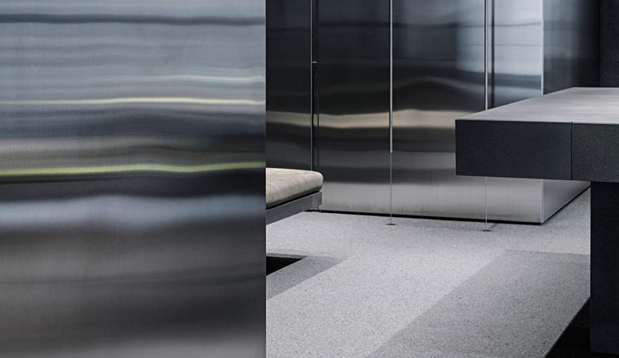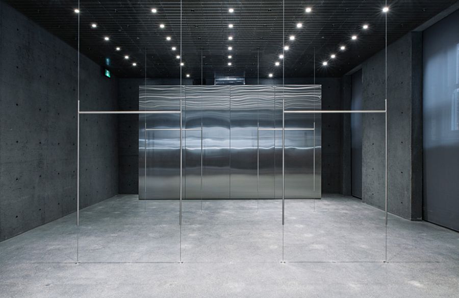 Заметные изменения претерпела входная группа магазина. Так, размер центральной двери стал 3, 5х1, 85 м. На верхнем этаже появилось дополнительное мансардное окно. Но внимание посетителей будет сконцентрировано, разумеется, на интерьере. Во флагманском бутике принцип торговли несколько отличается от привычных стандартов. Например, покупатели сначала выбирают на сайте модели, а затем приезжают, чтобы примерить их на месте. Именно поэтому третий и четвертый этажи отведены под примерочные комнаты с большими шкафами. Склад компании находится в подвале, который соединен со всеми уровнями специальным лифтом для транспортировки одежды. В пространстве магазина демонстрируется лишь небольшая часть коллекций. Для демонстрации использованы стеклянные витрины и полки из нержавейки, закрепленные на растяжках между потолком и полом. Еще одна особенность дизайна – отлитая на заказ массивная бетонная мебель.