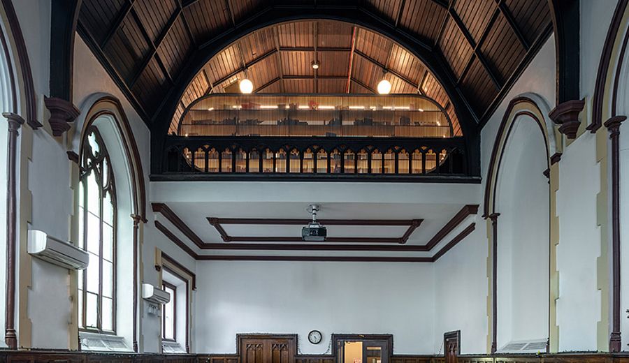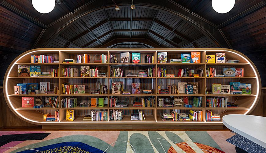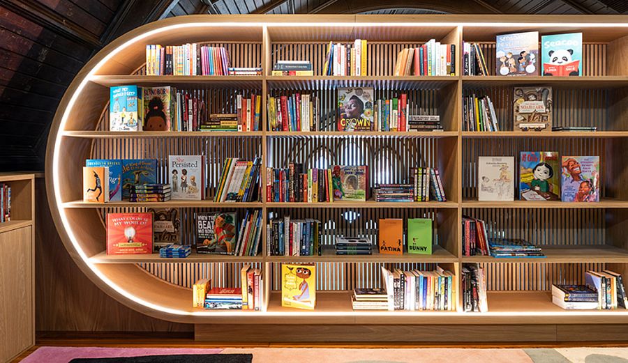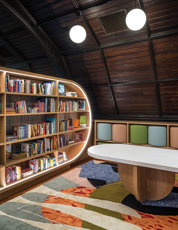 Вариант пластического решения пространства был подсказан архитекторам деревянными сводами церкви. По их словам, в дизайне книжных стеллажей обыграна форма бочки. Книжные полки являются своеобразным продолжением арки над антресолью исторического здания, где много лет назад находился церковный орган. Чтобы подчеркнуть это архитектурное «родство», авторы интегрировали светодиодную подсветку по краям конструкций.