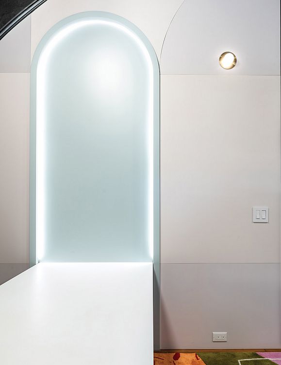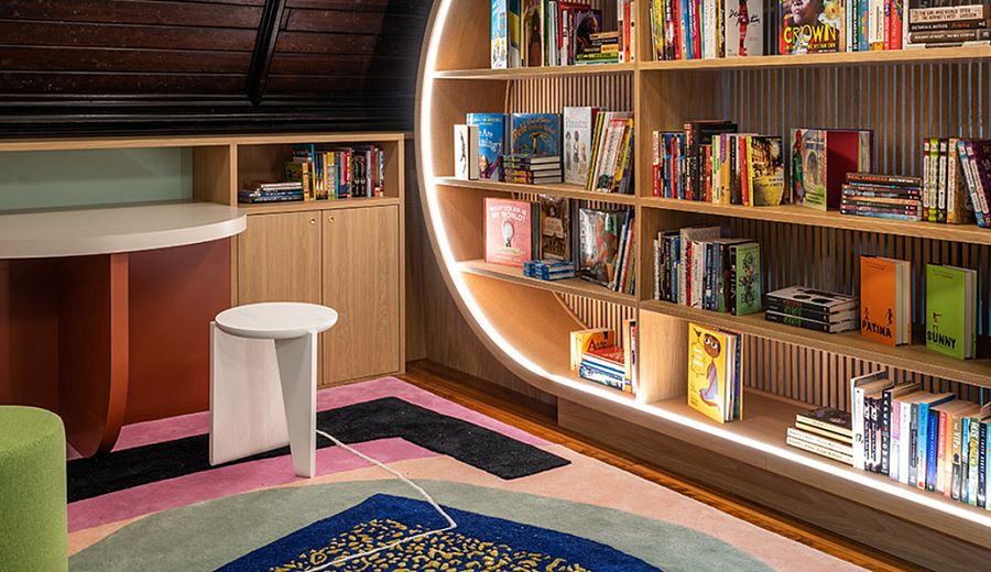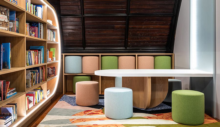 Мебели в пространстве библиотеки немного: пуфы для посетителей и пара столов из кориана, частично встроенных в стену. Для того, чтобы добавить цвета в пространство, архитекторы использовали коврики, спроектированные студией Proba.