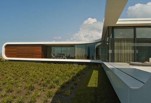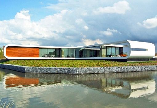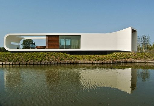Новое сооружение от бюро Waterstudio. NL расположено на побережье Вестланда (Нидерланды). Минималистская структура на плане, да и по форме напоминает бумеранг. Фасады постройки с панорамным остеклением отделаны искусственным камнем. Ограничение по высотности вынудило авторов освоить подземное пространство.