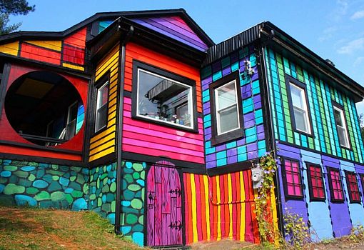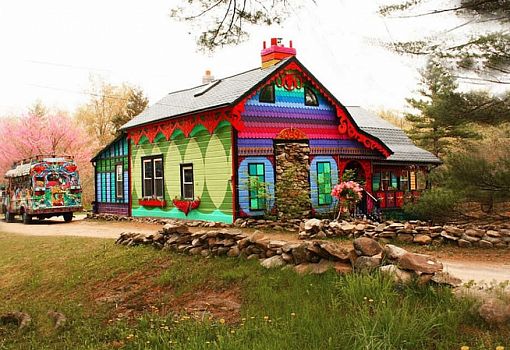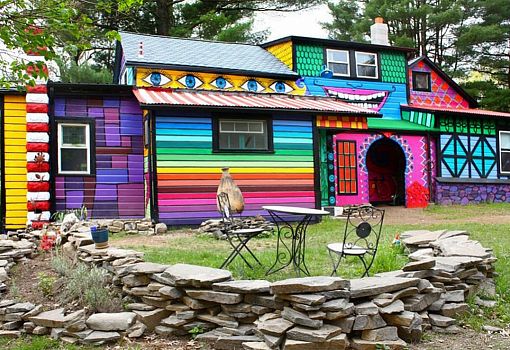 Художница Кэт О'Салливан превратил собственный загородный дом в штате Нью-Йорк, построенный еще в 1840 году, в сказочный калейдоскоп красок. Полихроматическая палитра в основном представлена яркими горизонтальными и вертикальными полосами, но есть в цветовом оформлении особняка и «кирпичи» и «каменная кладка» холодных сине-бирюзовых оттенков.