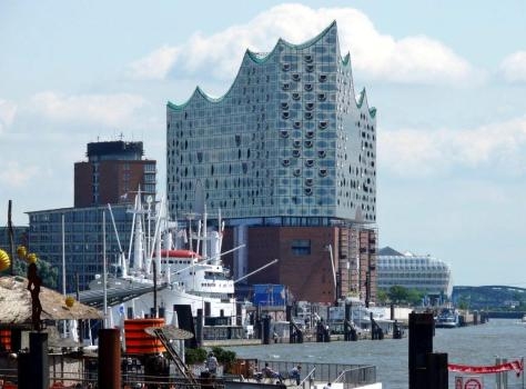 Продолжается строительство гамбургской филармонии. Сооружение  рассчитано на 2150 человек, сдать в эксплуатацию его планируют в следующем году. Любопытной особенностью проекта Elbphilharmonie от бюро Herzog & de Meuron является то, что он подразумевал реконструкцию старого кирпичного склада в гавани, контрастировавшего с объектами застройки XIX века. Культурный центр высотой 26 этажей  (110 м) демонстрирует любопытную концепцию: на основании, выдержанном в  индустриальном стиле, расположен стеклянный объем динамичной формы с кровлей, напоминающей волны. Нужно отметить большой перепад высот «гребней» – целых 30 метров.