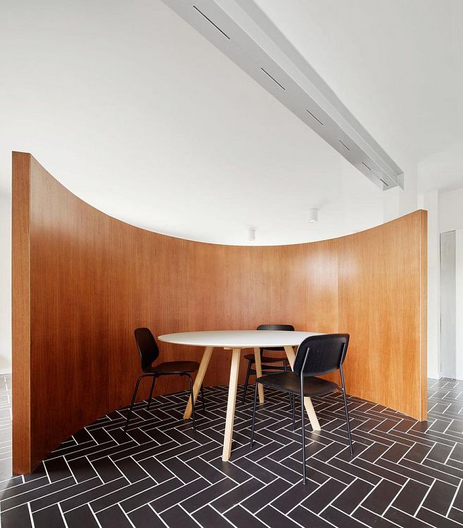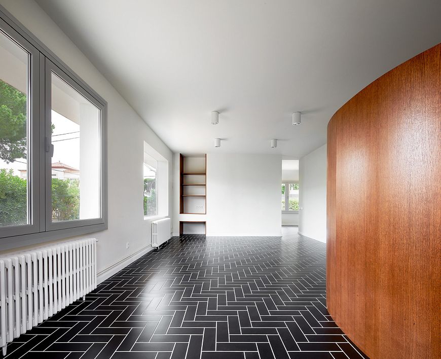 На первом этаже квартиры изменилась конфигурация кухни; это помещение словно бы «раскрылось» в напрвлении гостиной. После реконструкции здесь появилась скругленная перегородка, отделяющая обеденную зону от гостевого пространства. Высота этой перегородки всего 180 см, она не достает до потолка, поэтому между функциональными зонами существует пространственная связь. Еще одно изменение коснулось отделки: на нижнем этаже мы видим пол из черной керамической плитки с рисунком «в ёлочку». На втором этаже сохранились пять спален, однако теперь в них прозрачные раздвижные двери, значительно расширившие функциональные возможности этих помещений.
