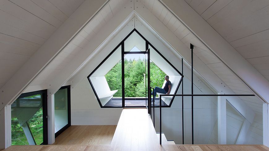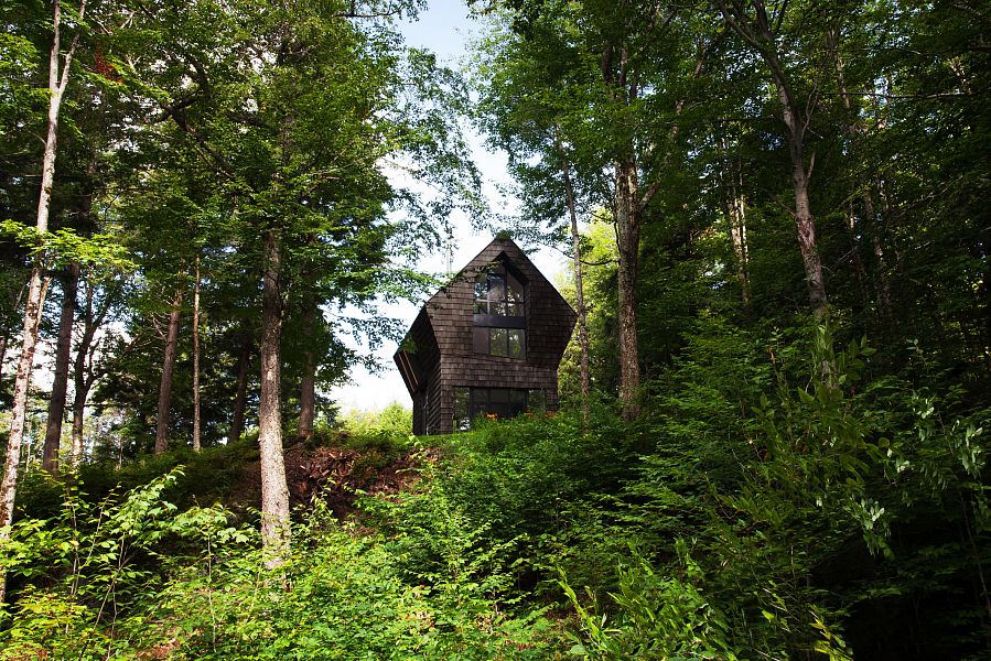 Этот необычный загородный дом находится в Саттоне (Канада) и построен он по проекту бюро YH2. До недавнего времени здесь находился небольшой одноэтажный сарайчик, который превратился благодаря архитекторам в полноценное трехэтажное жилище. Впрочем, чтобы не нанести урон окружающей природе, строители не стали демонтировать фундамент, только укрепили его.
