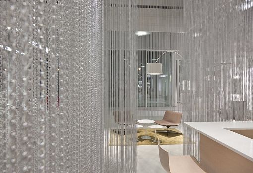 В дизайне демонстрационного зала одной мебельной компании звучат нотки сюрреализма. Все благодаря продуманному освещению, которое подчеркивает динамику модульной инсталляции из свисающих с потолка цепей. Самые длинные элементы декора достигают 7,8 метра. Так дизайнеры компании Kriska DECOR воплотили и интерпретировали образ дождя.