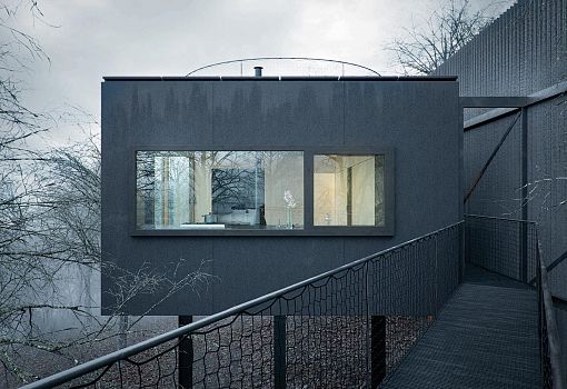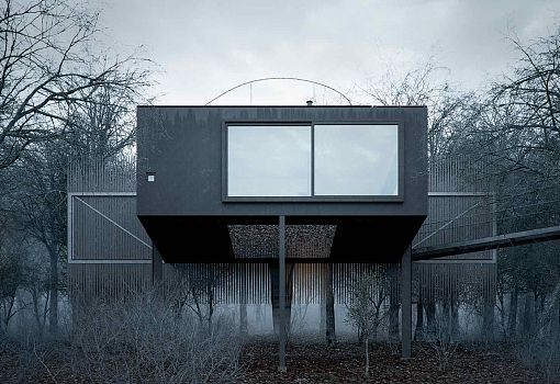 Новый проект бюро WOJR – это не мираж на окраине леса, а минималистская конструкция из дерева. Дом Mask House стоит на сваях и выделяется большой реечной стеной, визуально размывающей границы архитектуры, что привносит в проект немного мистики. Экстерьер демонстрирует открытость. Таков, например, объем с большими оконными проемами, открывающими живописный вид на озеро. Крыша дома используется как терраса.